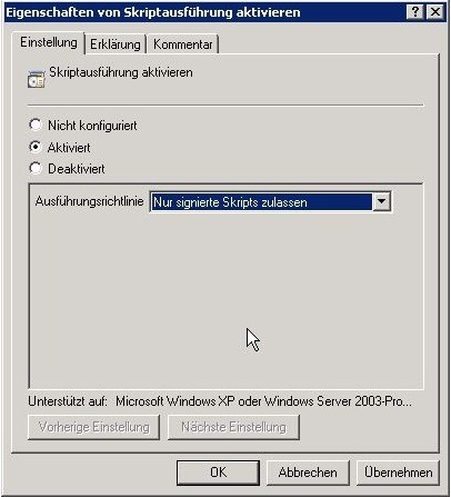 Um die “ExecutionPolicy” auf “AllSigned” zu setzen, kannn man eine Gruppenrichtlinie erstellen. Die entsprechende Einstellung findet sich unter “Computerkonfiguration” –> “Richtlinien” –> “Administrative Vorlagen” –> “Windows-Komponenten” –> “Windows PowerShell” –> “Skriptausführung aktivieren”.