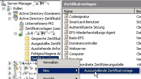 Bei den Zertifikatsdiensten kann man eine neue “Auszustellende Zertifikatsvorlage” erstellen und “Codesignatur” auswählen.