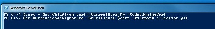 $cert = Get-ChildItem cert:\CurrentUser\My –CodeSigningCert Set-AuthenticodeSignature –Certificate $cert –Filepath c:\script.ps1