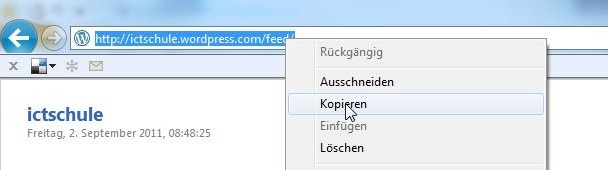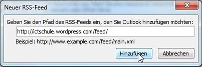 Wenn man nun in der neuen Ansicht auf “Feed abonnieren” klickt, wird der Feed im Internet Explorer eingetragen. Wenn man ihn in Outlook verfolgen möchte, muss man die Adresse aus der Adressleiste kopieren.