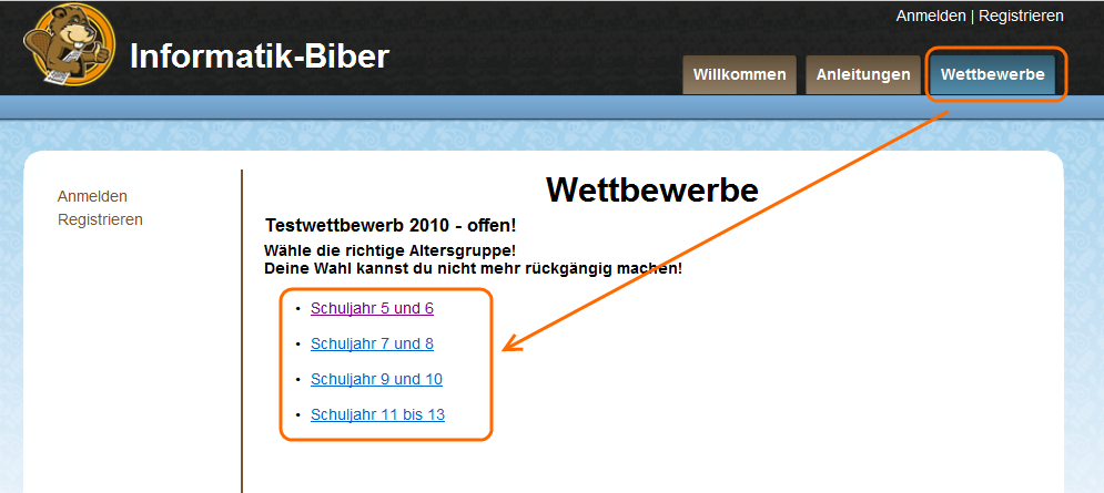 Hier kann man direkt die Aufgaben vom letzten Jahr online lösen. Dazu muss man zuerst auf die Registerkarte “Wettbewerbe” klicken und dann die entsprechende Stufe auswählen. Somit kann man schon ein wenig für dieses Jahr üben. ![]()
