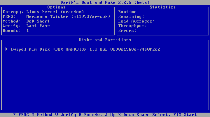 Zurück im Hauptfenster muss man nur noch F10 drücken, um DBAN zu starten. Danach ist die Festplatte vollständig gelöscht.