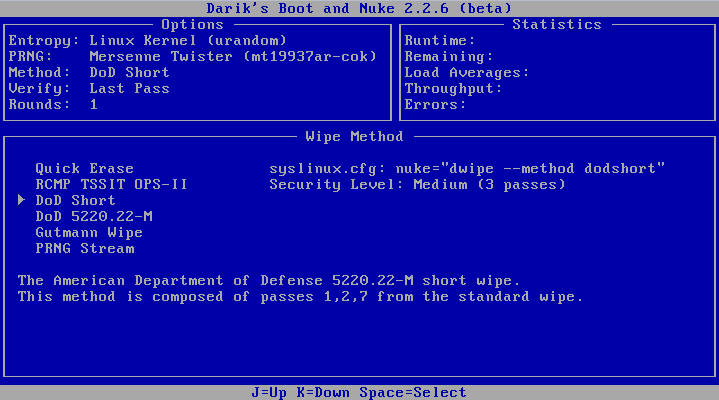 Standardmässig ist “DoD Short” ausgewählt. Dies ist ein Standard, der dem “Department of Defense” genügt und die Fesplatte dreimal hintereinander mit zufallsgenerierten Nullen oder Einsen füllt. Seit ich aber in der Computerzeitschrift c’t gelesen habe, dass sie niemanden gefunden haben, der eine einmal mit Nullen beschriebene Festplatte wieder herstellen kann, wechsle ich jeweils mit “M” zu einer anderen Methode. Hier kann man nun mit den Pfeiltasten zu “Quick Erase” wechseln und wieder mit Space (Leertaste) bestätigen. ![]()