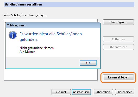 Falls ein Name nicht korrekt geschrieben ist, wird in einem Popupfenster darauf hingewiesen, damit man dem nachgehen kann: