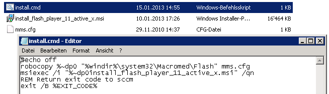 Nun erstelle ich also einen Ordner auf dem SCCM Server mit der MSI Datei, der mms.cfg Datei und einer install.cmd Datei für die Installation mit dem folgenden Skript: