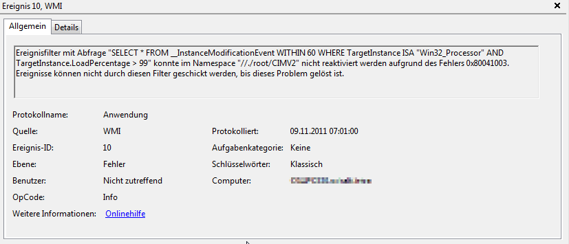 Ereignisfilter mit Abfrage "SELECT * FROM __InstanceModificationEvent WITHIN 60 WHERE TargetInstance ISA "Win32_Processor" AND TargetInstance.LoadPercentage > 99" konnte im Namespace "//./root/CIMV2" nicht reaktiviert werden aufgrund des Fehlers 0x80041003. Ereignisse können nicht durch diesen Filter geschickt werden, bis dieses Problem gelöst ist.