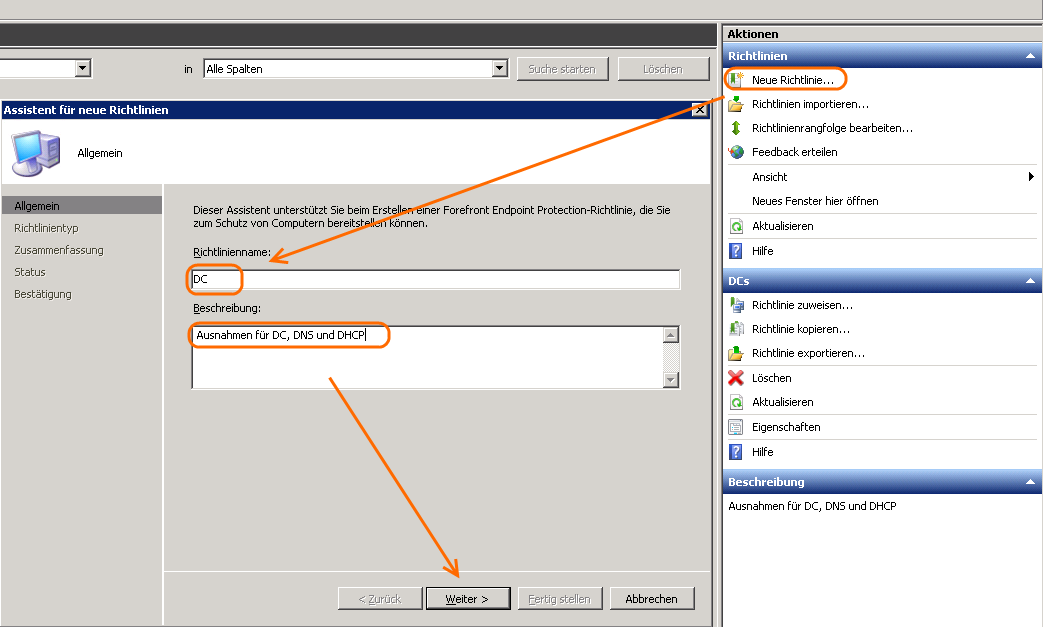 Um eine Richtlinie für einen Server zu erstellen, der Domänencontroller, DNS-Server und DHCP-Server ist, habe ich einfach die drei Richtlinienvorlagen genommen und die Ausschlüsse in einer Richtlinie zusammengefasst.