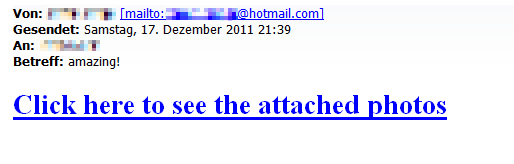 Heute wurde ich auf ein Mail aufmerksam gemacht, das scheinbar schon einige unserer Lehrpersonen erhalten haben. Gesendet von einem bekannten Absender (in dem Fall einem Schüler), mit Betreff “amazing!” und als einzigem Inhalt einem Link “Click here to see the attached photos”