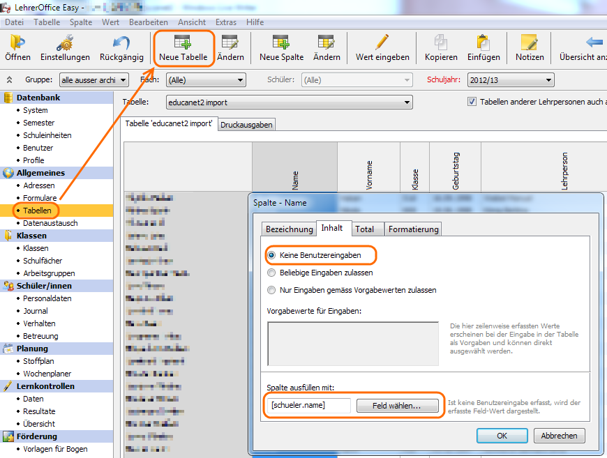 In der Zwischenzeit habe ich einen “Workaround” gefunden, um zumindest die Erstellung der Schülerdatei stark zu vereinfachen. Dazu erstellt man eine Arbeitsgruppe “alle ausser archivierte” mit allen aktiven Schüler/-innen. Nun kann man über “Tabellen” –> “Neue Tabelle” eine neue Tabelle für diese Arbeitsgruppe erstellen.