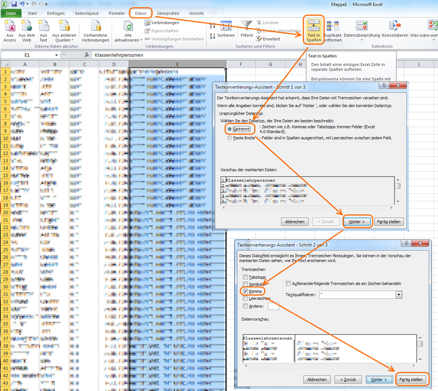 Das Umstellen und Löschen der nicht benötigten Spalten ist schnell erledigt. Bei uns sind aber oft die Parallellehrpersonen gegenseitig als Klassenlehrpersonen eingetragen. In der Spalte Klassenlehrperson stehen also oft zwei oder sogar 3 mit einem Komma voneinander getrennten Namen, obwohl man nur den ersten für die Synchronisation benötigt. Dies kann man aber einfach in Excel über das Register “Daten” –> “Text in Spalten” lösen.