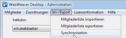 Nach der Auswahl der Institution kann man aus dem Menü “Im-/Export” “Synchronisation” wählen.