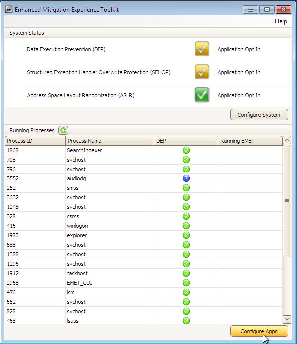 Nachdem man EMET 3.0 gestartet hat, kann man auf “Configure Apps” öffnen.