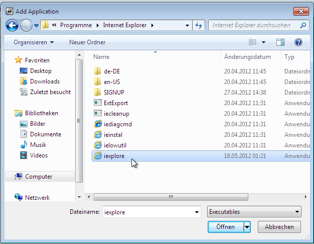 Nun kann man den Internet Explorer und C:\Programme (x86)\Internet Explorer\iexplore.exe (bei 64bit Maschinen)resp. C:\Programme\Internet Explorer\iexplore.exe hinzufügen.