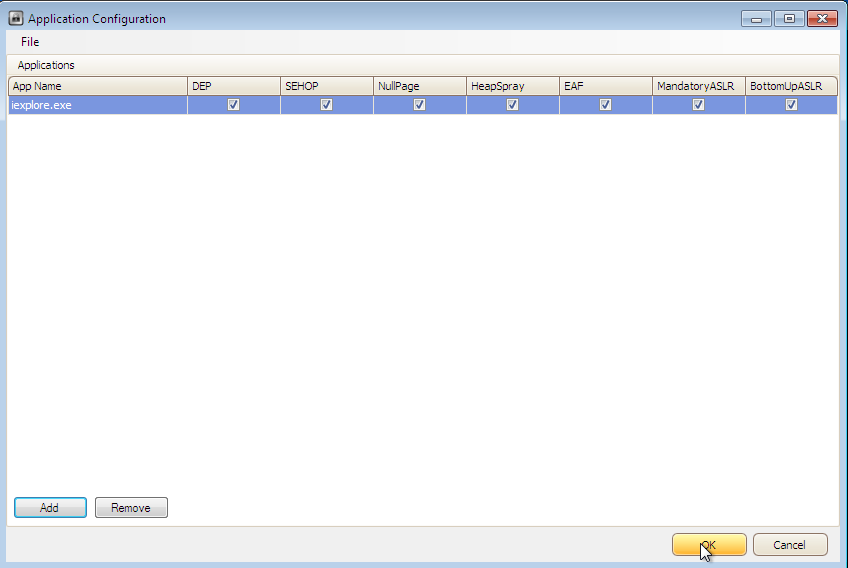 Nun kann man die Liste der durch EMET geschützten Programme (im Moment nur IE) mit einem Klick auf OK bestätigen.