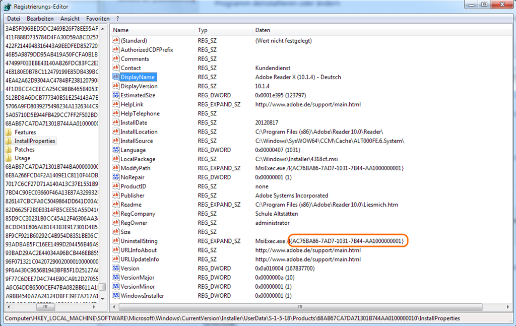Durch eine Suche in der Registry nach dem Namen “Adobe Reader” findet man schnell den “product code”, in diesem Fall {AC76BA86-7AD7-1031-7B44-AA1000000001}