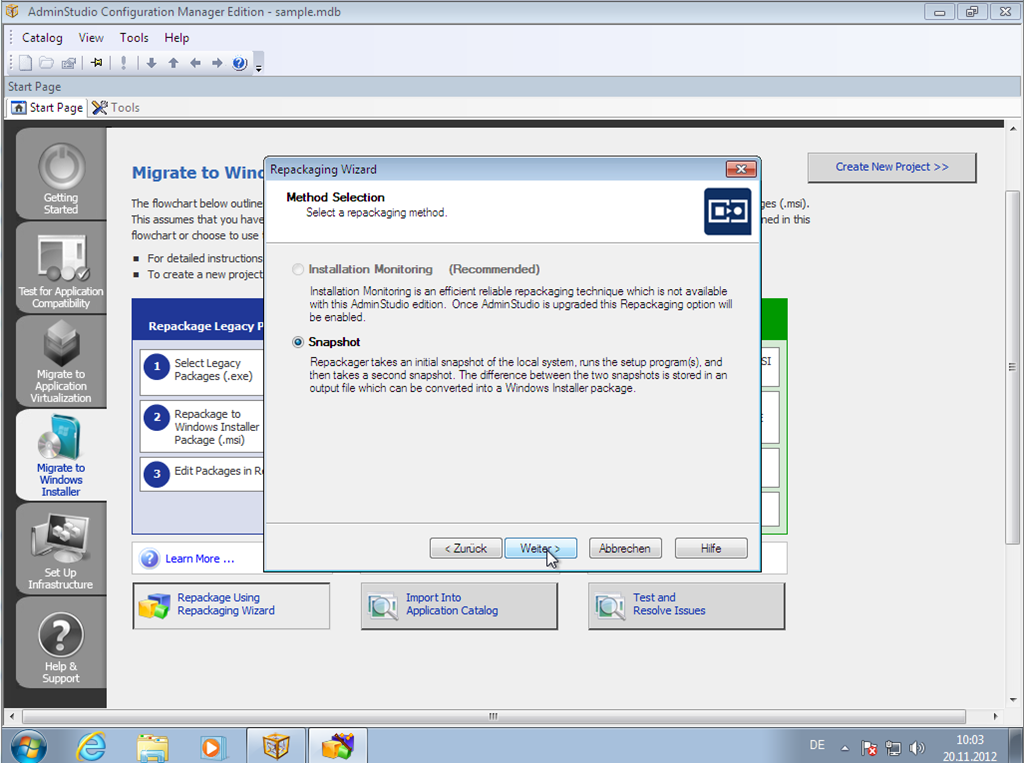 Mit dieser Software kann man einen Snapshot des Computers vor der Installation erstellen, dann die Software installieren und am Schluss wieder einen Snapshot erstellen. Der Unterschied zwischen den beiden Snapshots wird dann so abgelegt, dass man ein MSI daraus erstellen lassen kann. Hier habe ich eine Anleitung zur Verwendung von Admin Studio erstellt.