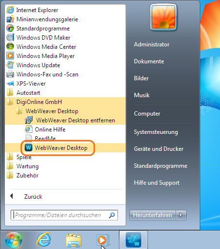 Nach der Installation von WebWeaver Desktop findet sich dieser im Unterordner “DigiOnline GmbH”. Natürlich kann er auch wie alle Programme unter Windows 7 gefunden werden, indem man die ersten Buchstaben des Programms zu tippen beginnt.