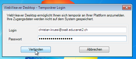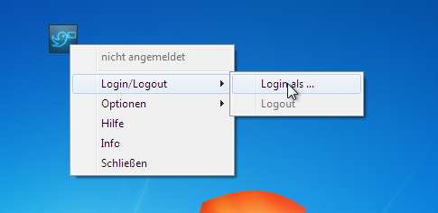 Danach erscheint ein schwebendes Symbol auf dem Desktop (zuerst mit einem Vogel, nach erfolgter Anmeldung mit dem Educanet2 Symbol). Man kann sich nun über “Login/Logout” –> “Login als…” anmelden oder die Anmeldedaten über “Optionen” –> “Profilverwaltung” erfassen.