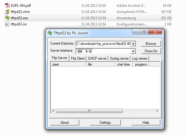Die empfohlene Möglichkeit, die neue Firmware zu installieren, ist auf den Switch über CLI (Command Line Interface) zuzugreifen, und vom Switch aus über TFTP die Firmware herunterzuladen. Dazu habe ich Tftp32 verwendet. Man kann die Zip Version herunterladen und das Programm direkt aus dem extrahierten Verzeichnis ohne Installation starten.