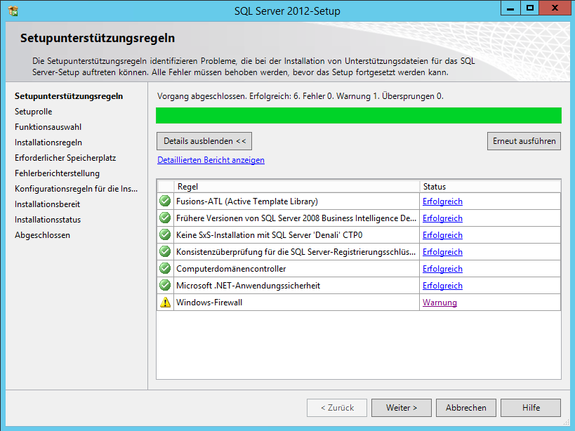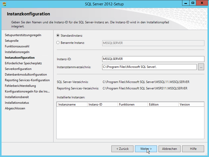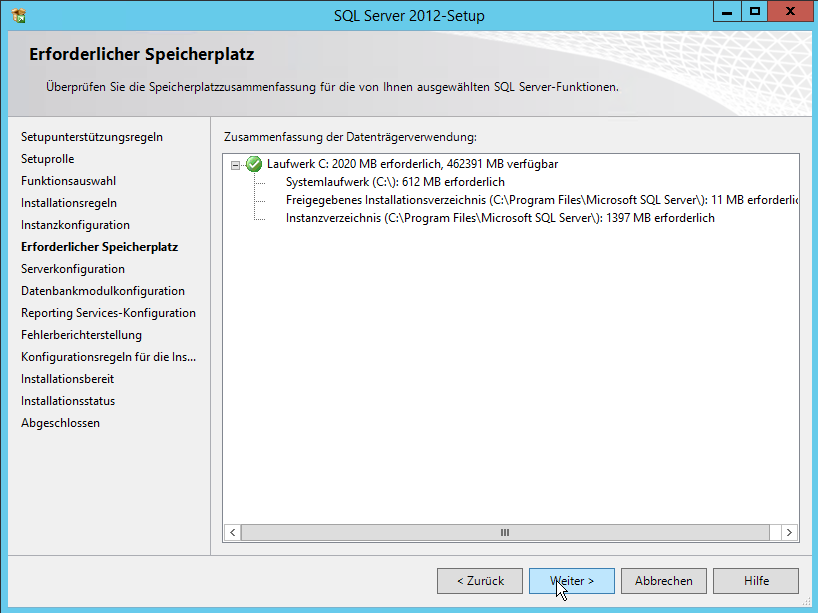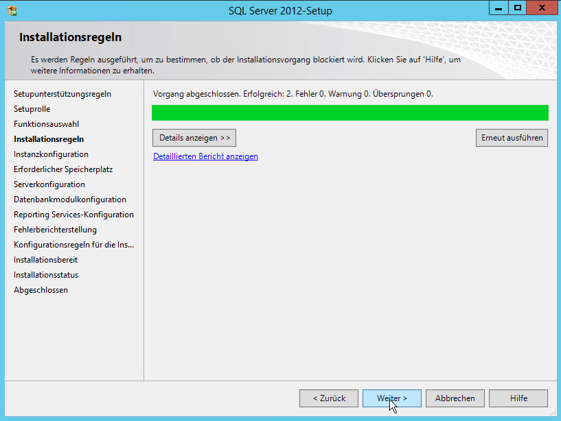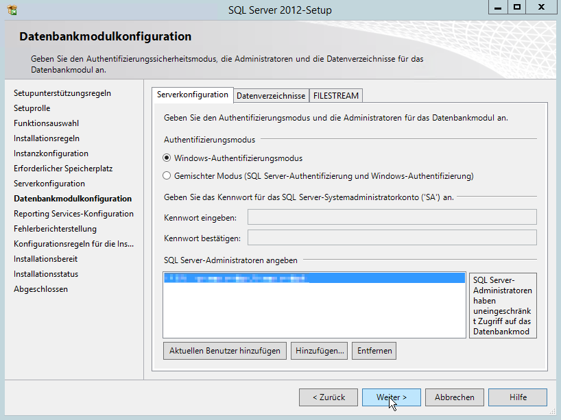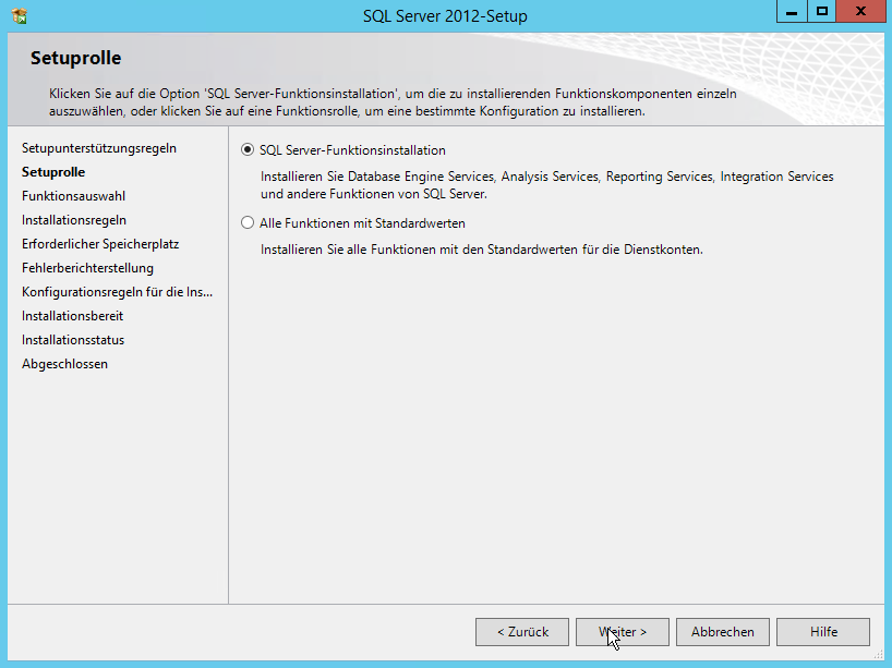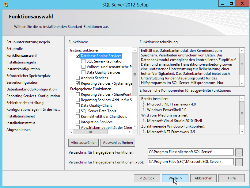 Gemäss Technet sollte SQL mit den folgenden Komponenten ausgeführt werden: “SQL Server-Datenbankmodul” und “Reporting Services”. Optional können die Management Tools auch noch installiert werden. Gemäss einem anderen Blog habe ich dann auch noch “Full-Text and Semantic Extractions for Search” installiert.