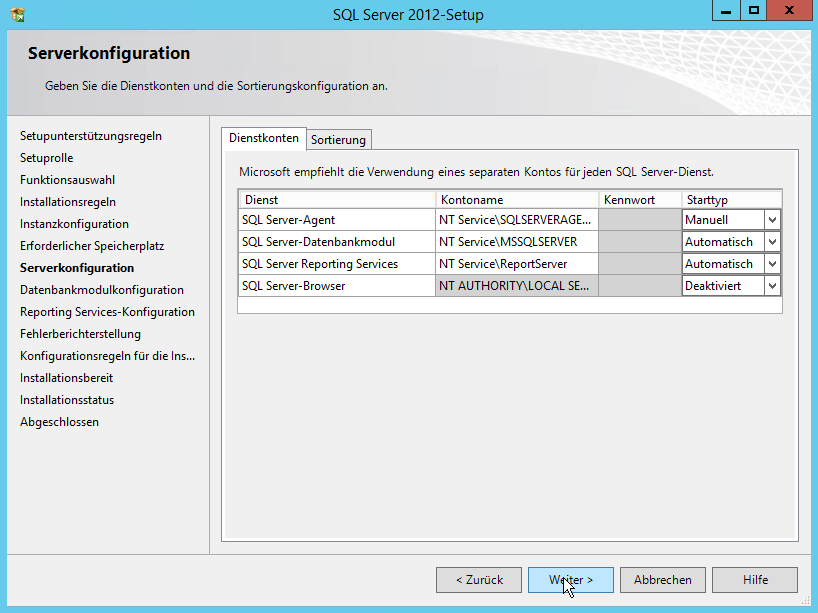 Am besten erstellt man dazu einen Domänenaccount als SQL Service Account, z.B. DOMAIN\SQLSVC.