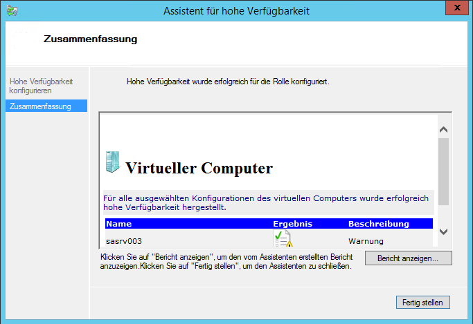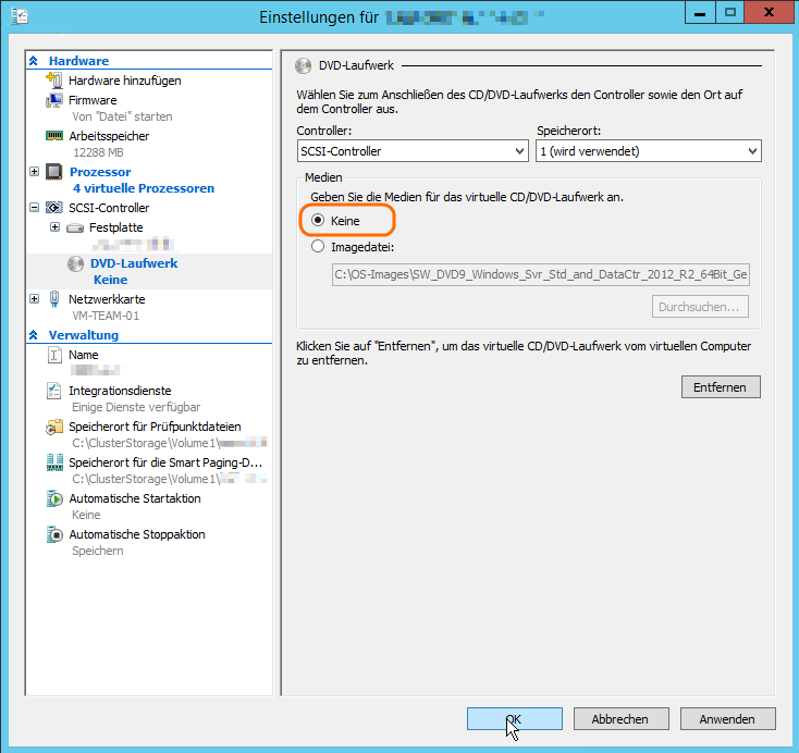 Dann sollte man auch noch die ISO Datei aus dem virtuellen DVD-Laufwerk auswerfen. Eine ISO Datei, die nicht von beiden Hosts erreichbar ist (lokales C: auf einem Host) verhindert eine Live-Migration resp. einen Failover.