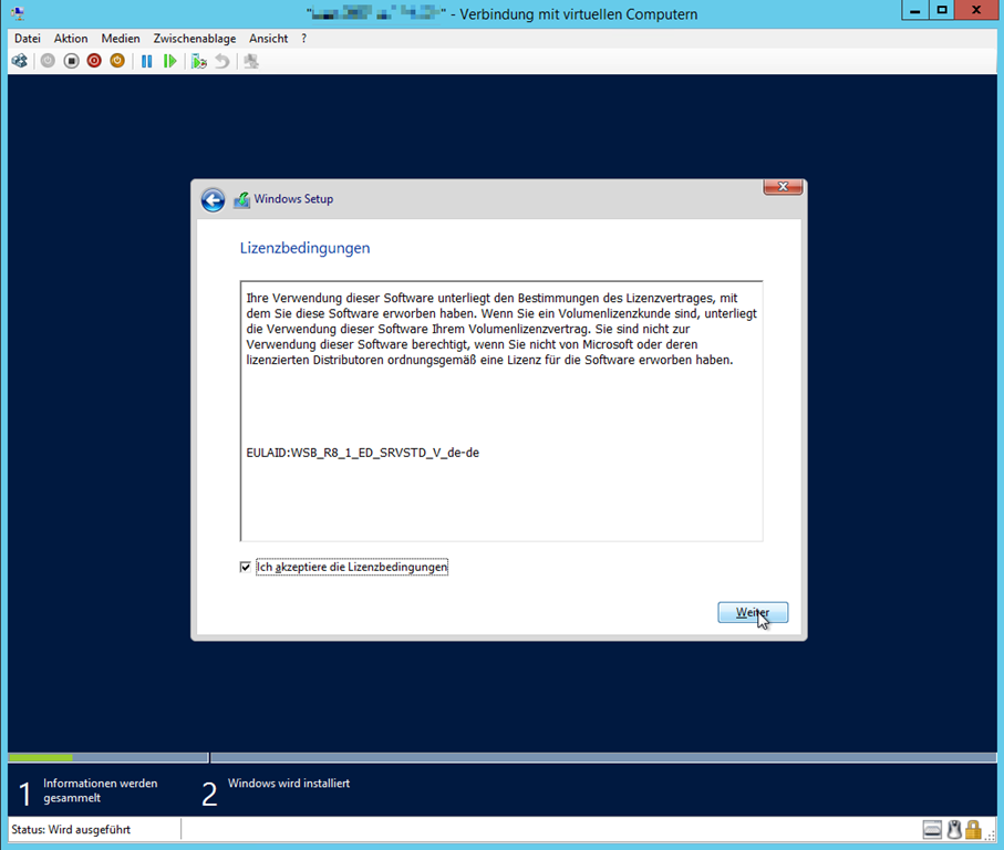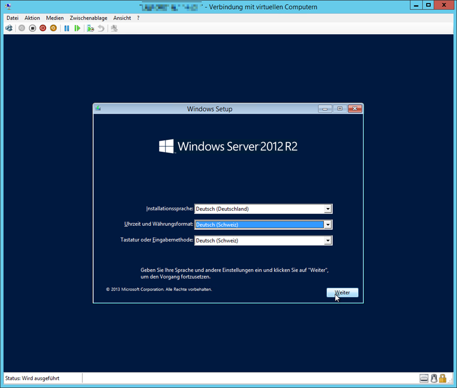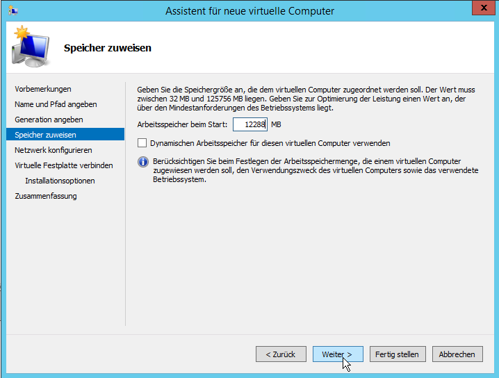 Der Assistent benötigt nun die Grundparameter für die virtuelle Maschine.