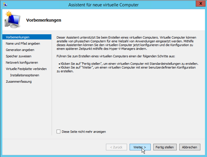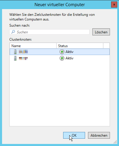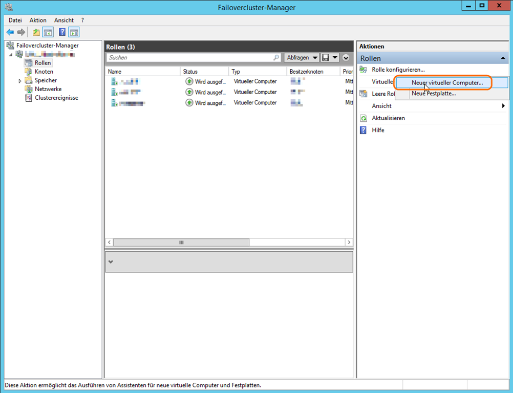 Im Failovercluster-Manager (oder im Hyper-V-Manager wenn man keinen Cluster hat), kann man einen neuen virtuellen Computer hinzufügen.