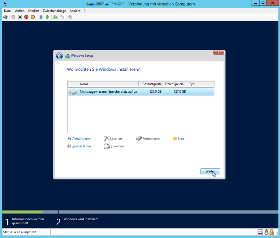 Für die virtuelle Festplatte lasse ich die vorgeschlagenen 127 GB stehen und erstelle je nach Verwendungszweck des Servers später noch eine zweite Festplatte (D:) für die Daten.