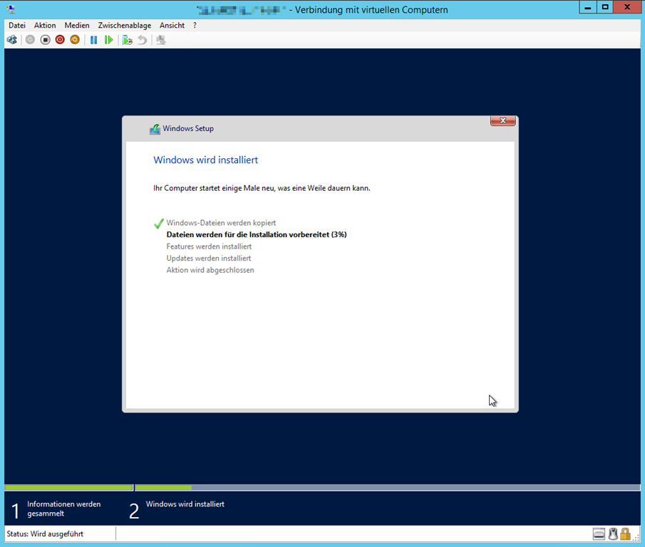 Hier bekomme ich jeweils eine Fehlermeldung, dass die eingelegte CD (resp. ISO Datei (und damit die virtuelle Maschine)) nicht auf einen anderen Clusterknoten verschiebbar ist (weil die ISO Datei auf dem lokalen C: liegt). Das ist aber kein Problem. Nach erfolgreicher Installation “wirft” man die virtuelle CD ja wieder aus und dann ist wieder alles verschiebbar.