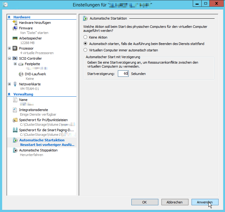 Dann kann man noch die “Automatische Startaktion” und die “Automatische Stoppaktion” anpassen. Sinnvoll erscheint mir im Moment automatisches Starten mit Startverzögerung und Gastbetriebssystem herunterfahren.