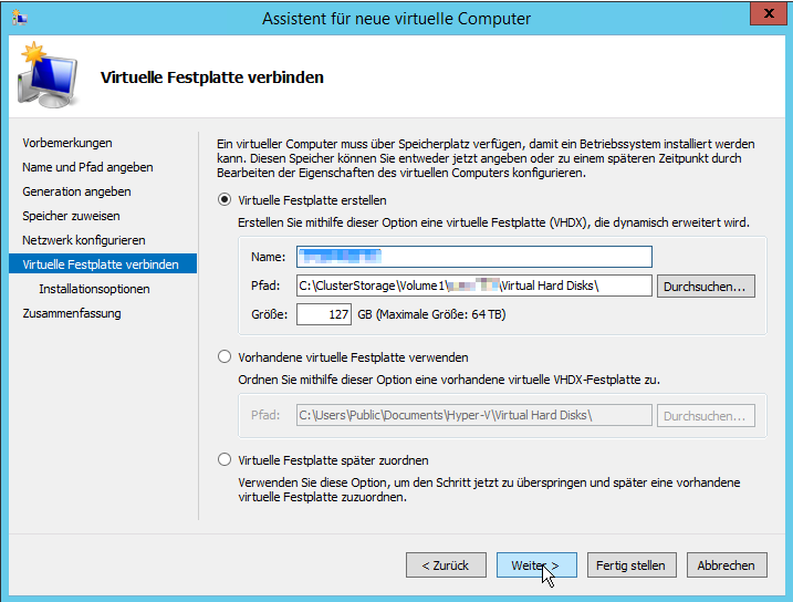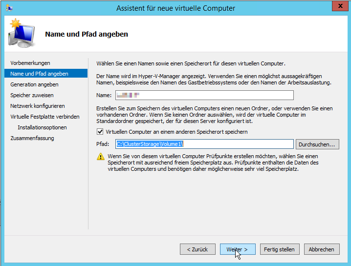 Man muss einen Namen vergeben und den Speicherort auswählen. Im Falle eines Clusters muss sich der Speicherort auf dem CSV (Cluster Shared Volume) befinden, auf das alle Knoten des Clusters zugreifen können.