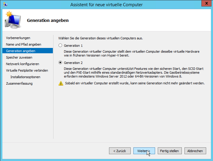 Für neuere virtuelle Maschinen kann man die neue Generation 2 verwenden.