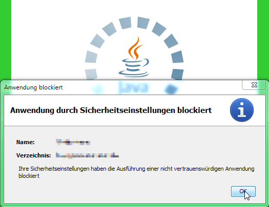 Mit den Standardeinstellungen von Java werden werden “nicht vertrauenswürdige Anwendungen” blockiert. Mit früheren Versionen von Java konnte man das Applet trotzdem ausführen lassen. Bei den neueren Versionen gibt es nur noch die Möglichkeit auf OK zu klicken. Danach bekommt man eine Fehlermeldung.