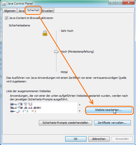 “Es wird dringend empfohlen, solche Anwendungen nicht auszuführen. Wenn Sie sich aber über die Risiken im Klaren sind und die Anwendung dennoch ausführen möchten, können Sie die URL dieser Anwendung der Liste der Exception Sites hinzufügen, die sich in der Registerkarte „Sicherheit“ des Java Control Panel findet.