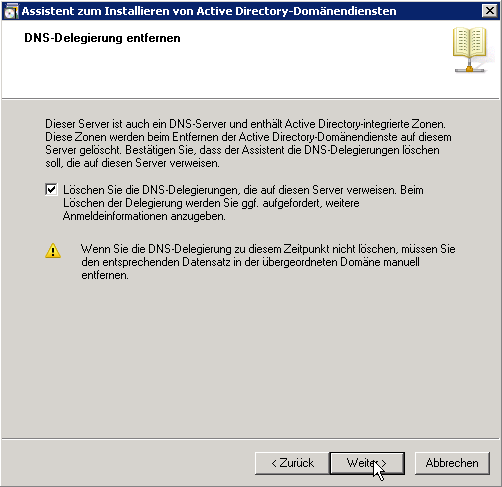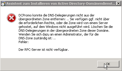 Leider kommt nun folgende Fehlermeldung. Wenn ich die Fehlermeldung richtig deute, ist das kein Problem. Es gibt bei uns keine übergeordnete Zone. Wichtig ist nur, dass die pointers auf diesen DNS Server entfernt werden. Eine Überprüfung im DNS hat dann auch ergeben, dass der herabgestufte Server nicht mehr unter “domaindnszones” aufgeführt ist, scheint also alles seine Richtigkeit zu haben.