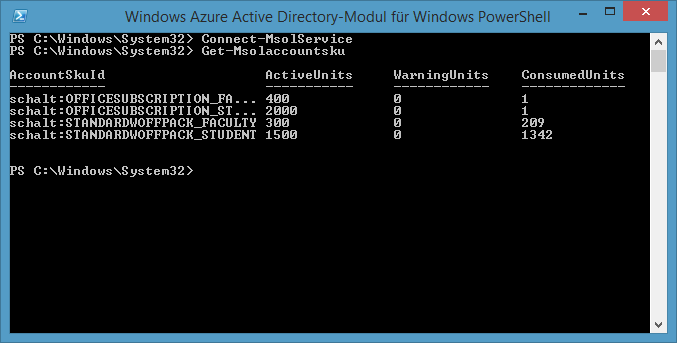 Um Office 365 Lizenzen mit Powershell zu verwalten, muss man das Azure Active Directory Modul für Powershell verwenden. Hier ist beschrieben, wie man das installiert und verwendet.