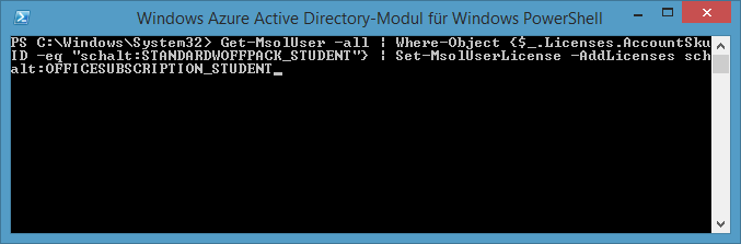 Get-MsolUser –all | Where-Object {$_.Licenses.AccountSkuID –eq “schalt:STANDARDWOFFPACK_STUDENT”} | Set-MsolUserLicense –AddLicenses schalt:OFFICESUBSCRIPTION_STUDENT