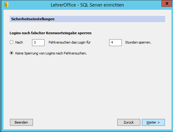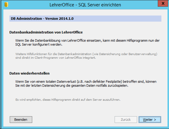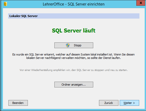 Wir haben 4 Schulgemeinden und daher auch 4 Datenbanken. Um eine weitere Datenbank zu importieren, kann man das DB Administrationsprogramm nochmals ausführen (unter C:\Program Files (x86)\LehrerOffice\SQL Server) und die oben gezeigten Schritte nochmals durchgehen.