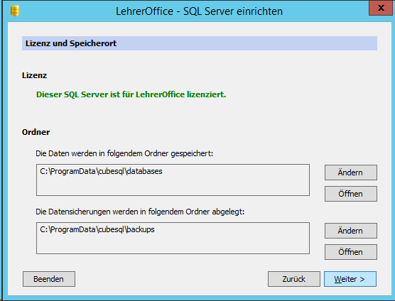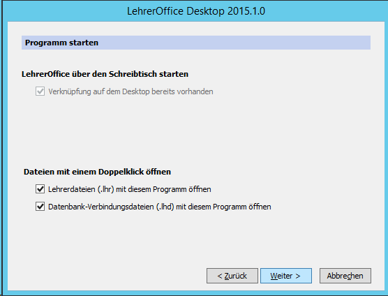 Für die Verbindungsdateien (die mit dem LHD) sollte man auch einen Ort wählen, auf den die verbundenen Benutzer Zugriff haben werden. Daher habe ich einen Unterordner unter C:\Lehreroffice gewählt.
