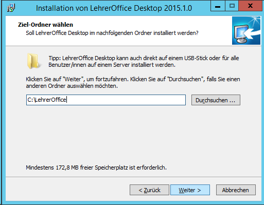 Für die Installation wähle man einen Ordner, den man dann übers Netz freigeben kann, z.B. C:\LehrerOffice.