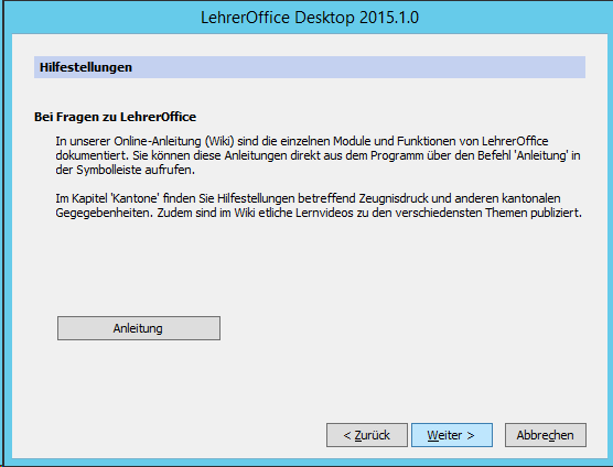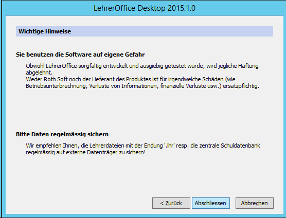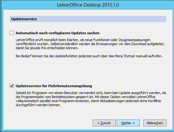 Im nächsten Schritt muss man das eigentliche Programm (Lehreroffice Desktop) installieren. Bei uns hat es sich bewährt, das Programm auf dem Server zu installieren und darüber zu arbeiten. Das Programm findet sich unter https://www.lehreroffice.ch/download/aktuelle-versionen/.