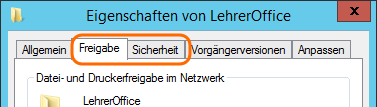 Nun sollte man das Verzeichnis noch für die Lehrpersonen freigeben. Man kann Berechtigungen für die Freigabe und die Sicherheitsberechtigungen auf NTFS Ebene vergeben. Ich vergebe jeweils Vollzugriff auf die Freigabe und steuere die Berechtigungen über die Einträge bei Sicherheit. Im Fall von Lehreroffice genügen Leseberechtigungen auf den freigegebenen Ordner.