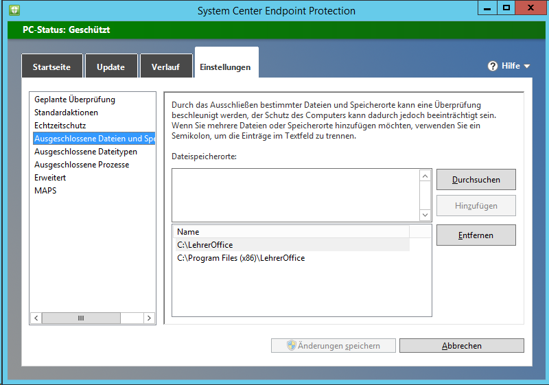 Auf dem Server sollte man die Lehreroffice Freigabe aus den Scans ausnehmen damit der Programmstart übers Netzwerk etwas schneller läuft (vgl. Nachteile der zentralen Installation).