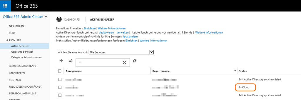 Danach kann man den Benutzer lokal anlegen und mit DirSync synchronisieren lassen. Im Office 365 Admin Center wechselt der Account kurz danach wie gewünscht auf “Mit Active Directory synchronisiert”.