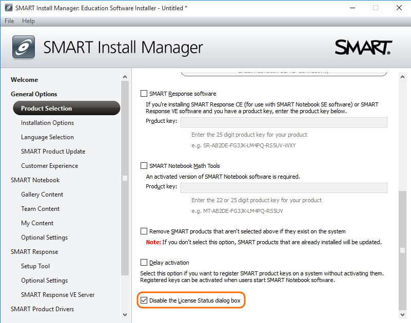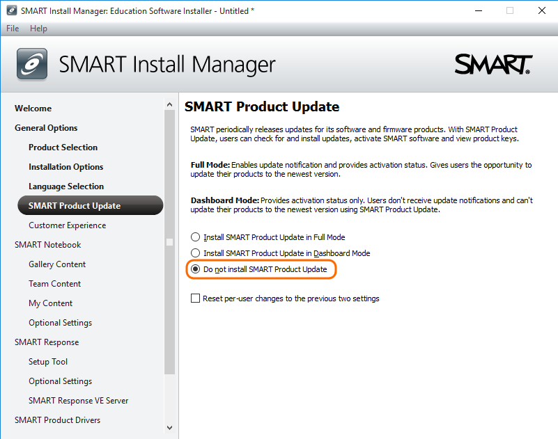 Da die Software zentral verteilt wird, wählt man bei den Updates am besten “Do not install SMART Product Update”.