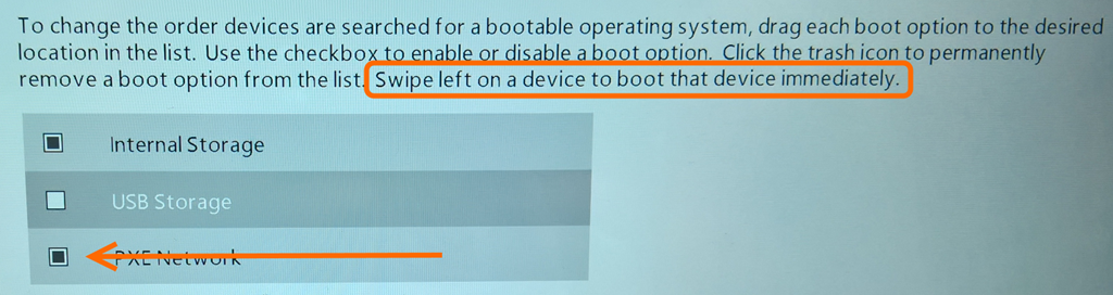 Um das Surface über das Netzwerk zu booten, kann man beim Start die “Leiser Taste” drücken oder ganz praktisch direkt aus der UEFI Einstellung im Bild oben über “PXE Network” booten, indem man mit dem Finger nach links darüber streicht.
