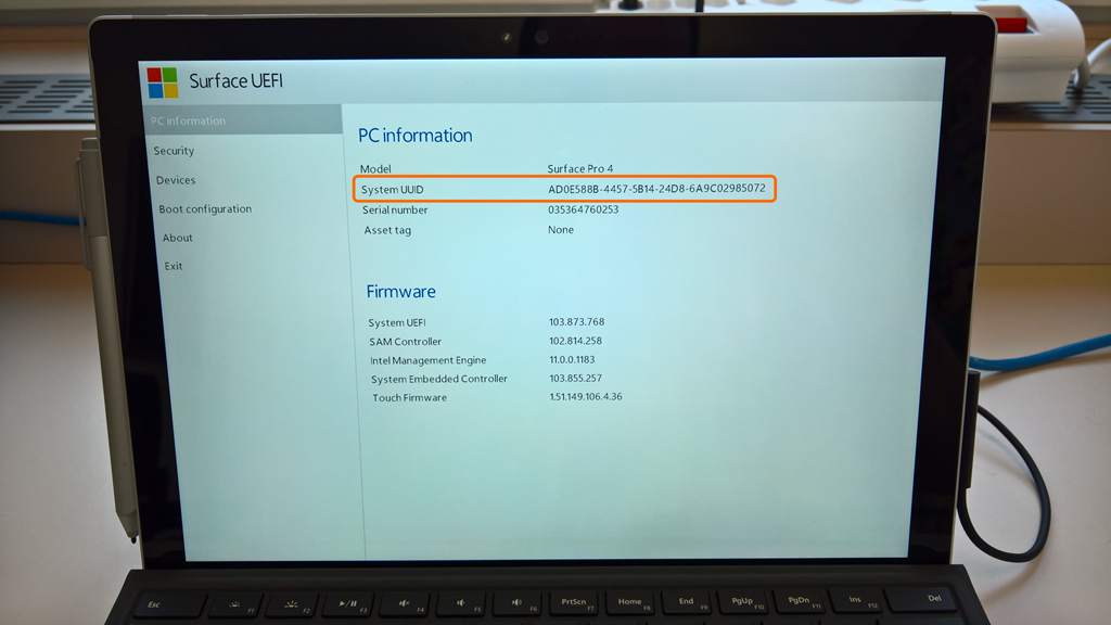 Das Surface hat ja keinen Ethernet Adapter. Um es über PXE mit SCCM (oder WDS) neu aufzusetzen, benötigt man einen USB-Ethernet Adapter. Das vorgängige Anlegen des Computerkontos in SCCM nennt sich Prestaging und kann über die MAC-Adresse oder die System-UUID gemacht werden. Da der USB-Ethernet Adapter nicht einem einzelnen Surface zugeordnet, sondern für mehrere benutzt wird, kann nicht (seine) MAC-Adresse fürs Prestaging verwendet werden. Im UEFI findet man unter “PC information” die System UUID, die statt der MAC Adresse benutzt werden kann.