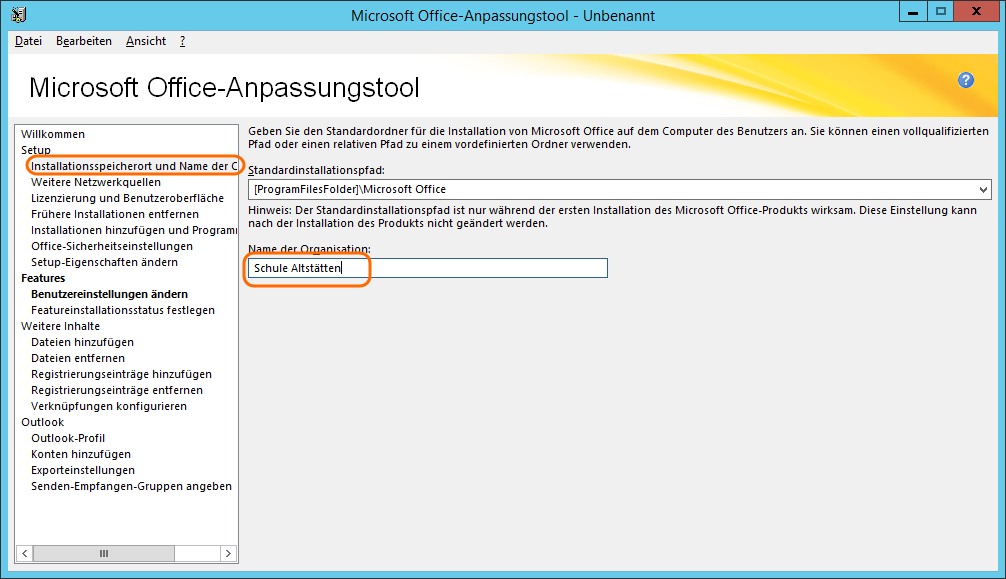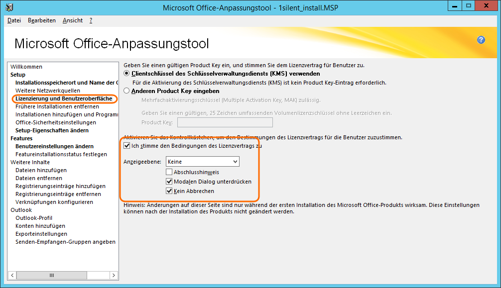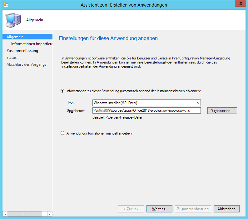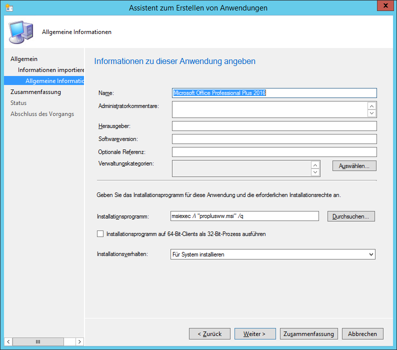 Das Office-Anpassungstool kann nun geschlossen werden. In SCCM kann nun eine neue Anwendung erstellt werden. Als MSI Datei wählt man die proplusww.msi im proplus.ww Ordner.