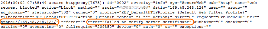Um das Problem einzugrenzen, schaut man sich den “Live Log” von “Web Filtering” an und filtert nach der IP Adresse des verwendeten Geräts. Wenn man nun WhatsApp öffnet und eine Nachricht versenden möchte, sieht man das Problem. Der Versuch, eine Verbindung mit https://169.45.248.124 herzustellen, bricht mit der Fehlermeldung “Failed to verify server certificate” ab.